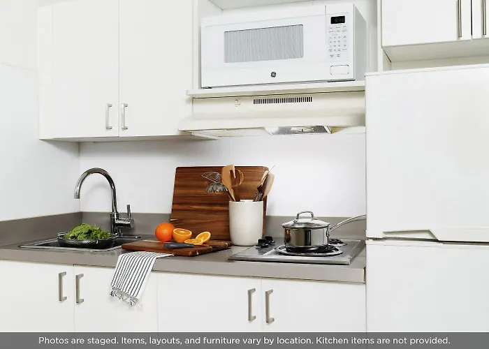 A microwave oven, a coffee maker, and a fridge are also featured in the rooms.