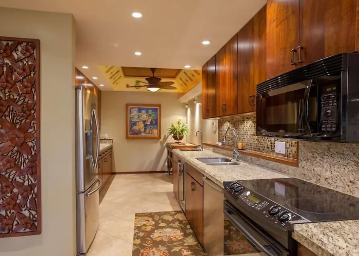 Water slides and an outdoor pool can be provided at a surcharge. Barbecue and a golf course are featured at Maui Westside Presents: Honua Kai - Luana Garden Villas 7B. There is a fitness club with a wide range of sports.