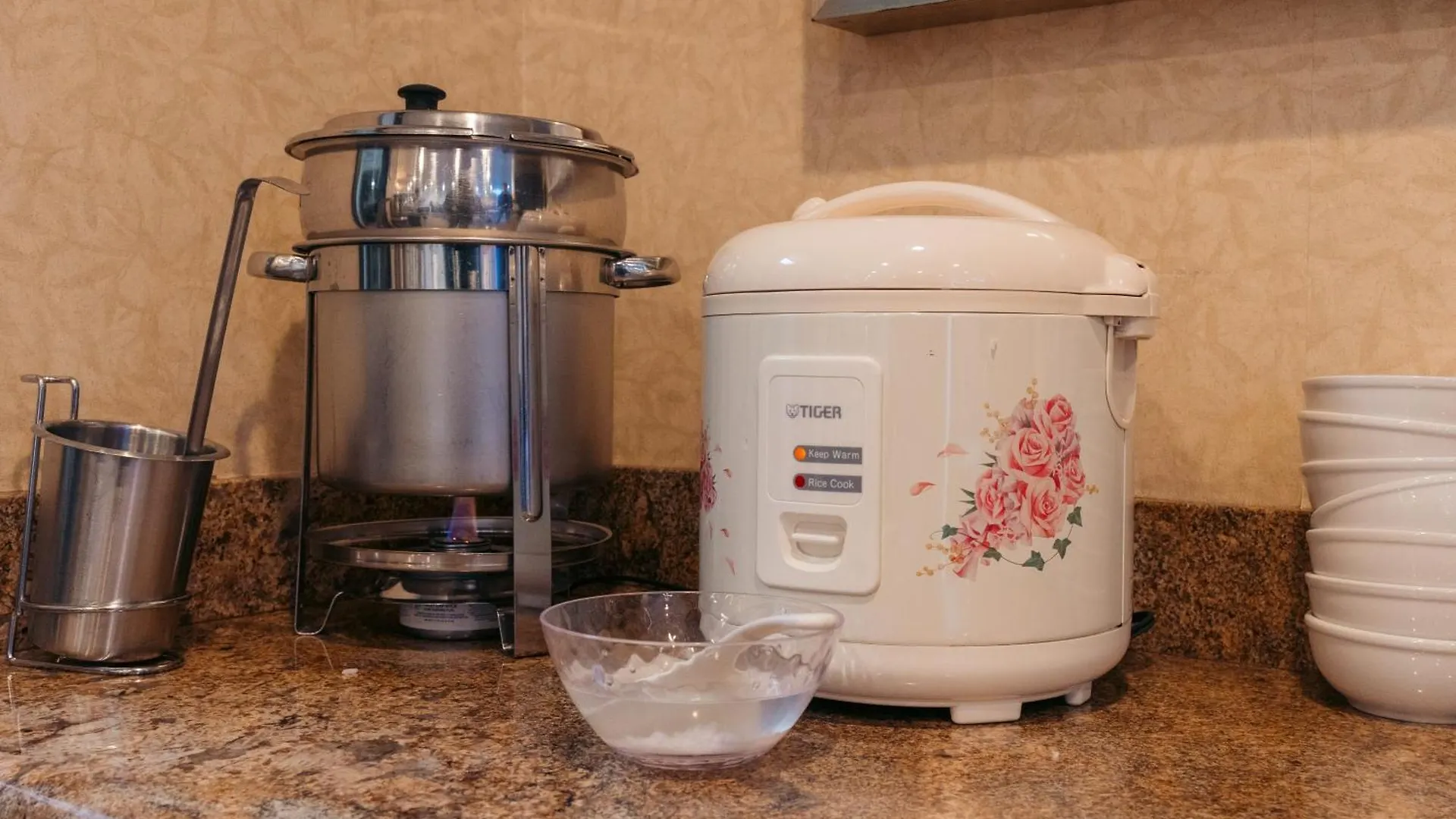 Coffee and tea making facilities, a refrigerator, and a cooktop are provided in the rooms.
