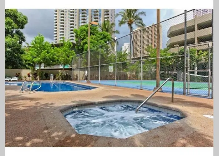 The 2-room Expansive Lanai W/ Panoramic Views - Walk To Waikiki Beach apartment is located only 0.7 km from the floor mall "Waikiki Shopping Plaza" and entices guests with a Jacuzzi, an outdoor swimming pool and locker rooms. The apartment lies a stroll from the calm - water Kuhio Beach Park.