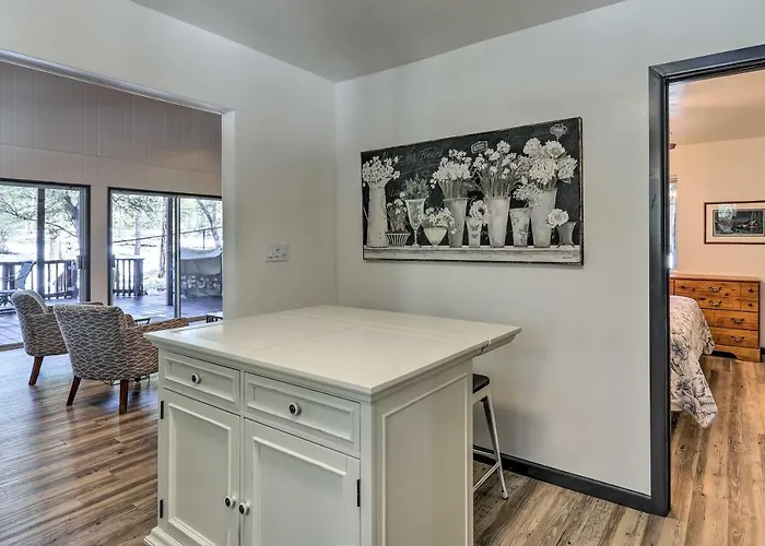 The 2-bedroom Rustic-Chic Prescott Cabin With Deck In Wooded Area! Villa is situated in Prescott, nearly a 15-minute drive from the style Smoki Museum and 2.5 km from Goldwater Lake. This property also has a fully furnished kitchen with a microwave oven, tea/coffee making equipment, and a fridge.